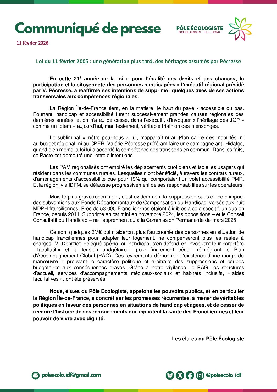 Nous, élu·es du Pôle Ecologiste, appelons les pouvoirs publics, et en particulier la Région Île-de-France, à concrétiser les promesses récurrentes, à mener de véritables politiques en faveur des personnes en situation de handicap et âgées, et à cesser de réécrire l’histoire de ses renoncements qui impactent la santé des Francilien·nes et leur pouvoir de vivre avec dignité.